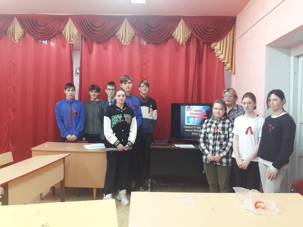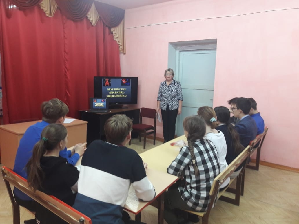 К Всемирному Дню борьбы со СПИДом соц.педагог провела с ребятами старших классов круглый стол "ВИЧ и СПИД - эпидемия века. Далее ребята просмотрели видеоролик "Невымышленная история Оли". В конце мероприятия сыграли в Анти -СПИД игру " Не передай это дальше".